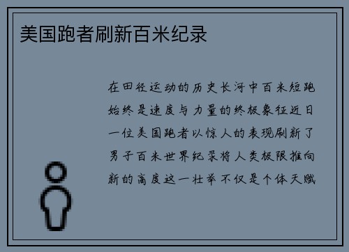 在田径运动的历史长河中,百米短跑始终是速度与力量的终极象征。近日,一位美国跑者以惊人的表现刷新了男子百米世界纪录,将人类极限推向新的高度。这一壮举不仅是个体天赋与努力的结晶,更是科学训练、技术革新...